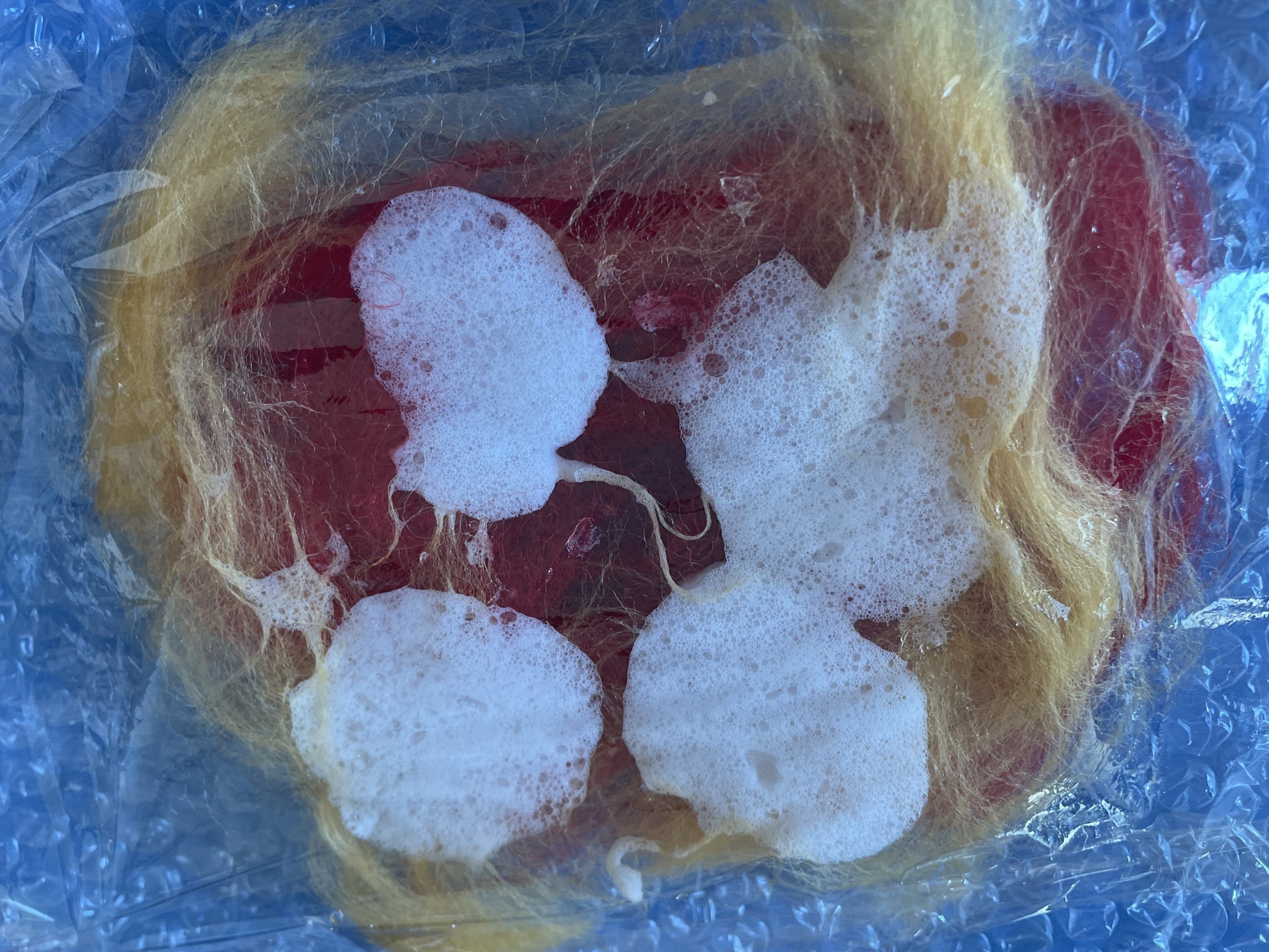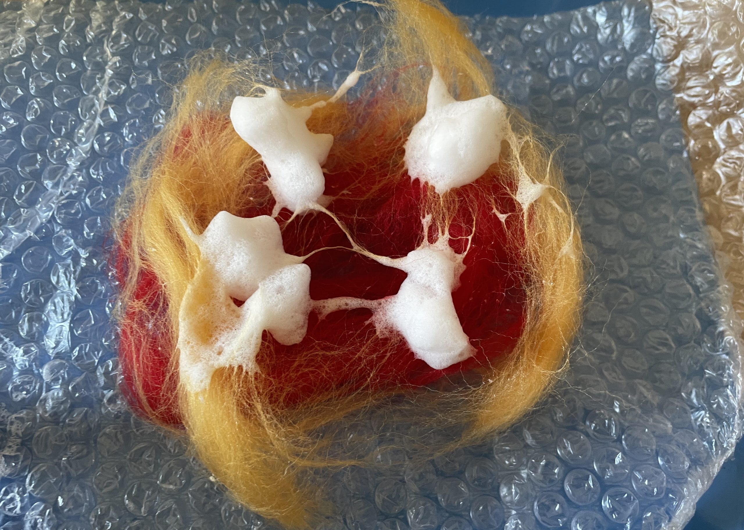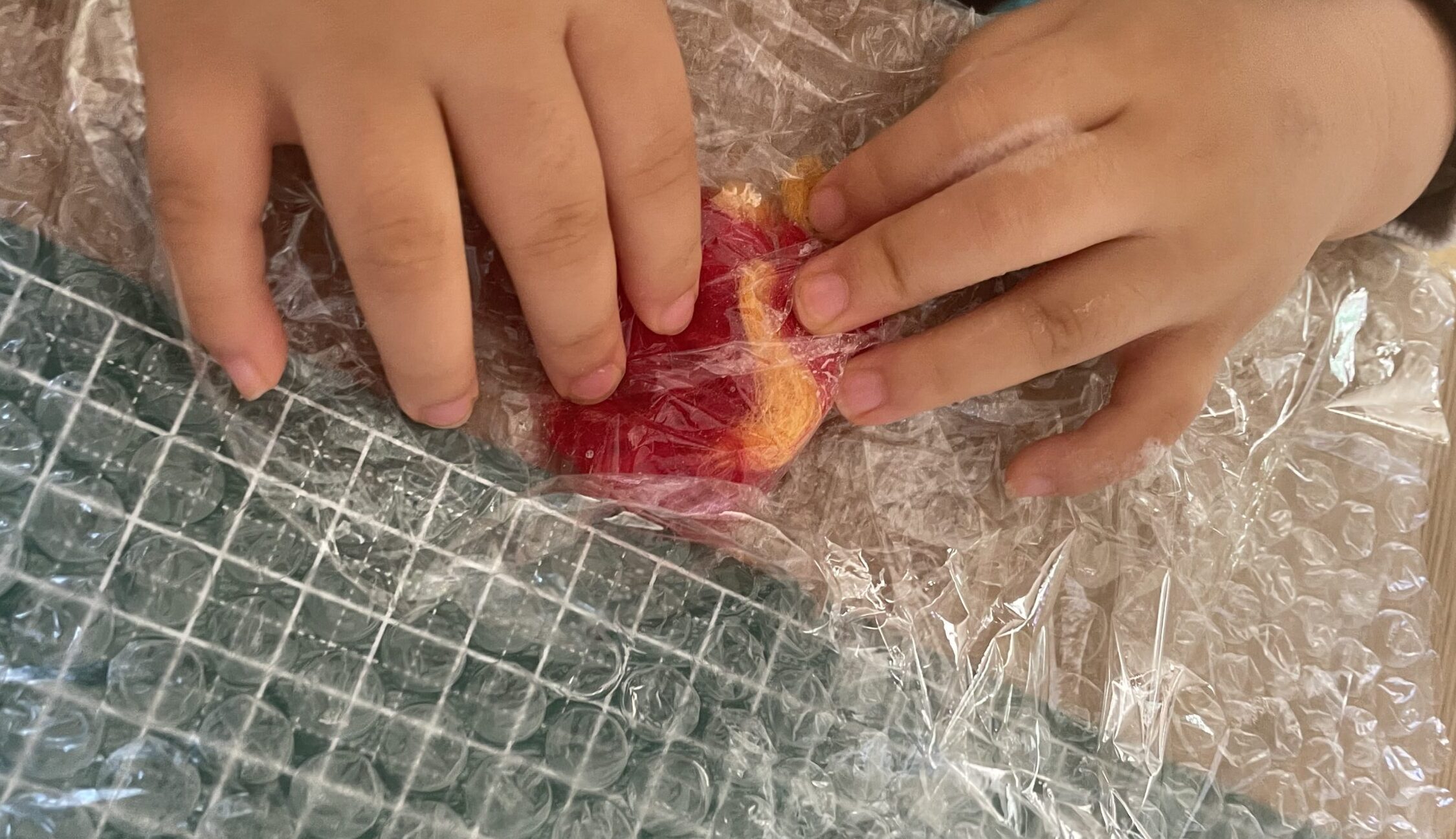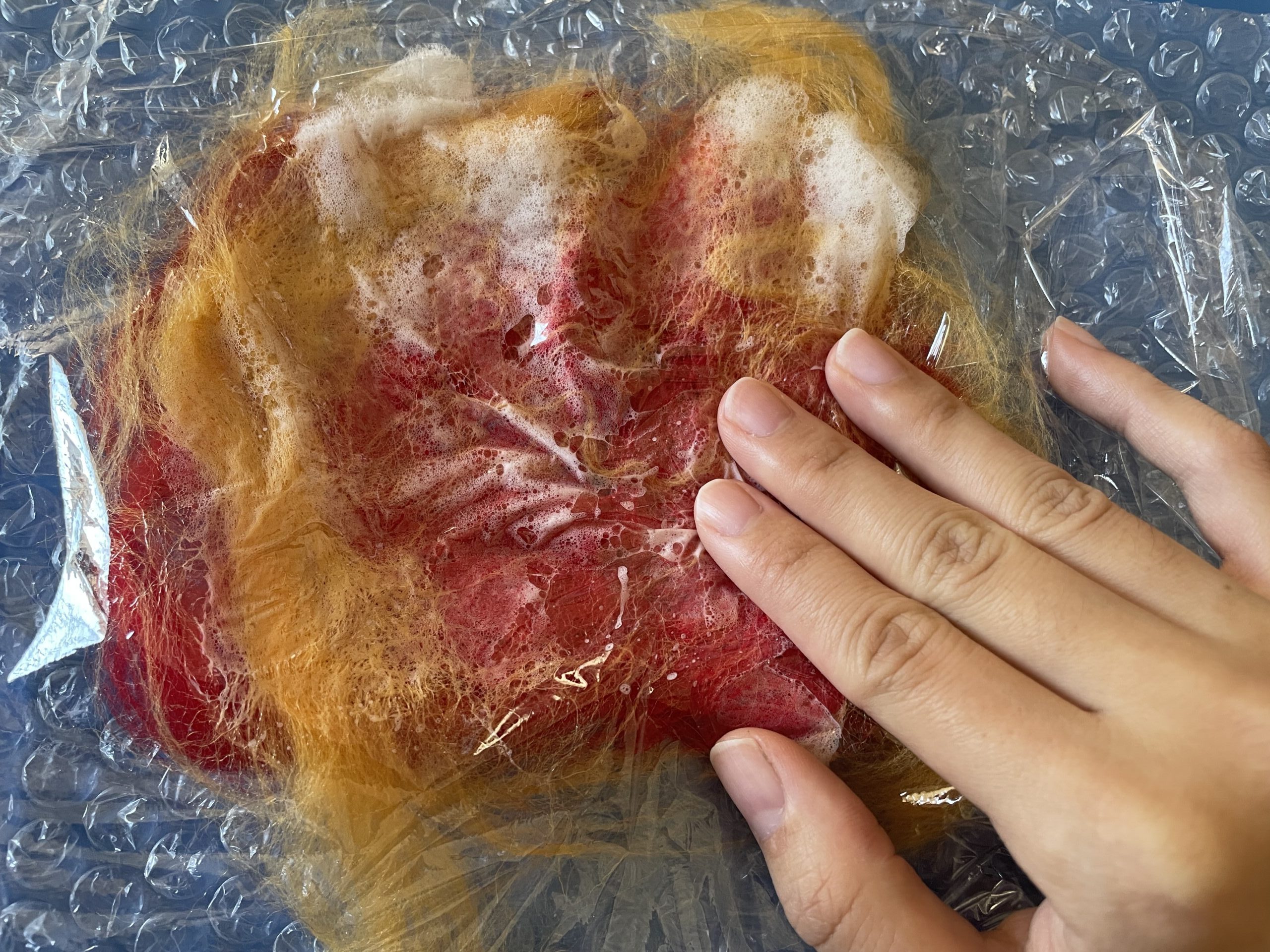 プチプチの凹凸と石鹸水の効果で、少しずつフェルト化していきます。