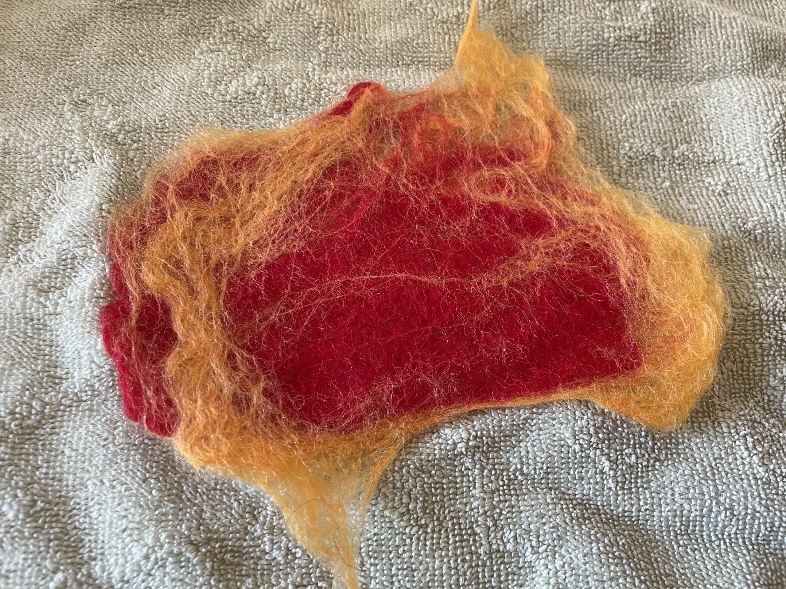 羊毛が一枚のシート状にまとまってきたら、ラップを外し、タオルに挟んで軽く押さえます。
